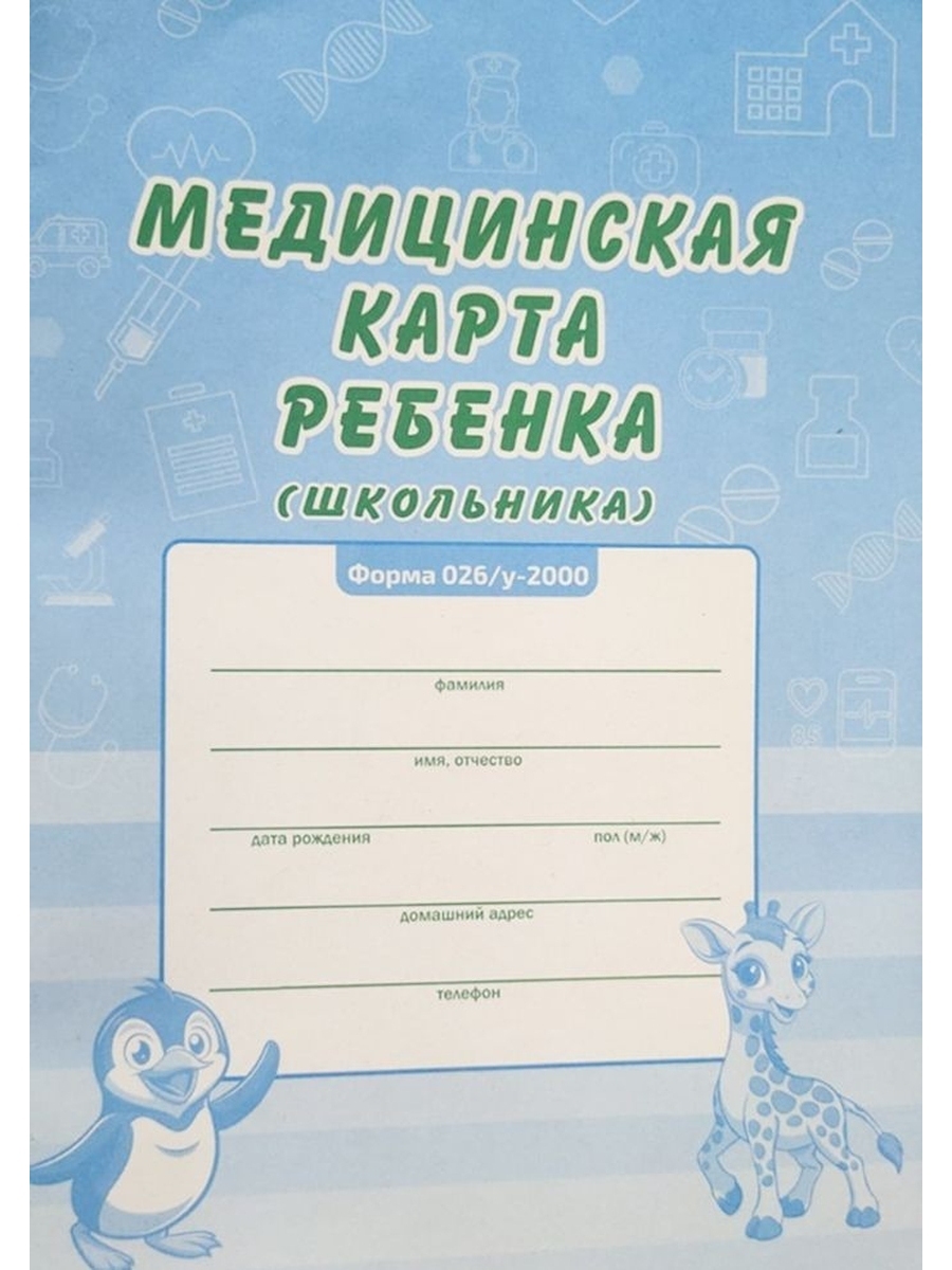 Медицинская карта ребенка (школьника). Форма 026/у-2000. Формат А4, 32 стр./16 листов, обложка - мягкая цветная офсетная, блок - офсетная бумага, крепление - скоба. Форма № 026/у–2000 утверждена Министерством здравоохранения Российской Федерации приказом от 3 июля 2000 года, № 241 Медицинская карта ребенка содержит разделы: 1. ОБЩИЕ СВЕДЕНИЯ О РЕБЕНКЕ 2. АНАМНЕСТИЧЕСКИЕ СВЕДЕНИЯ 3. СВЕДЕНИЯ О ДИСПАНСЕРНОМ НАБЛЮДЕНИИ 4. ОБЯЗАТЕЛЬНЫЕ ЛЕЧЕБНО-ПРОФИЛАКТИЧЕСКИЕ МЕРОПРИЯТИЯ 5. ИММУНОПРОФИЛАКТИЧЕСКИЕ МЕРОПРИЯТИЯ 6. ДАННЫЕ ПЛАНОВЫХ ПРОФИЛАКТИЧЕСКИХ МЕДИЦИНСКИХ ОСМОТРОВ: 6.1 Перед поступлением в ясли-сад, детский сад 6.2. За 1 год до школы 6.3. Перед школой 6.4. В возрасте 7 лет (по окончании 1-го класса школы) 6.5. В возрасте 10 лет (переход к предметному обучению) 6.6. В возрасте 12 лет 6.7. В возрасте 14–15 лет 6.8. В возрасте 16 лет 6.9. В возрасте 17 лет 7. РЕЗУЛЬТАТЫ ВРАЧЕБНОЙ ПРОФЕССИОНАЛЬНОЙ КОНСУЛЬТАЦИИ 8. РЕКОМЕНДАЦИИ ПО ЗАНЯТИЯМ СПОРТОМ, БАЛЬНЫМИ ИЛИ СПОРТИВНЫМИ ТАНЦАМИ (В СЕКЦИЯХ) 9. СВЕДЕНИЯ О ПОДГОТОВКЕ ЮНОШЕЙ К ВОЕННОЙ СЛУЖБЕ 10. ДАННЫЕ ТЕКУЩЕГО МЕДИЦИНСКОГО НАБЛЮДЕНИЯ 11. СКРИНИНГ-ПРОГРАММА БАЗОВАЯ (ДОШКОЛЬНЫЙ ЭТАП, ШКОЛЬНЫЙ ЭТАП)