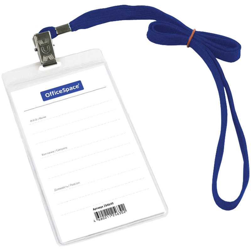 Бейдж вертикальный 63*105мм с клипсой на синем шнурке 284649