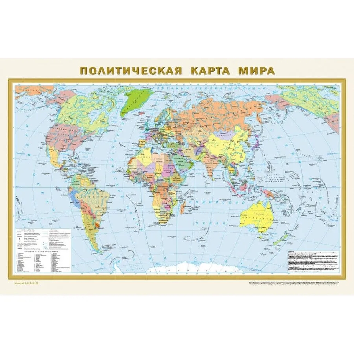 Эта настенная карта, покрытая с обеих сторон полимерной плёнкой, имеет размеры 870х580 мм. Она состоит из двух карт одинакового масштаба 1:40 000 000 (в 1 см 400 км). Физическая карта мира наглядно отражает распределение горного, равнинного и производных типов рельефа по поверхности суши Земли. Пунсонами с высотными отметками показаны высочайшие вершины всех континентов и основных горных систем. Объекты гидрологической сети на карте включают все наиболее крупные реки с притоками и озёра. Представлен также рельеф дна Мирового океана с выделением хребтов, котловин и глубоководных желобов с их наибольшими глубинами. В океанах показаны тёплые и холодные течения. На Политической карте показаны все независимые государства мира с их столицами, включая Россию в новых границах (с Донецкой и Луганской народными республиками, Запорожской и Херсонской областями), а также владения и территории с особым статусом. Населённые пункты на карте даны в трёх градациях численности: более 1 млн жителей, от 100 тыс. до 1 млн, менее 100 тыс. жителей. Рекомендовано для широкого круга пользователей.