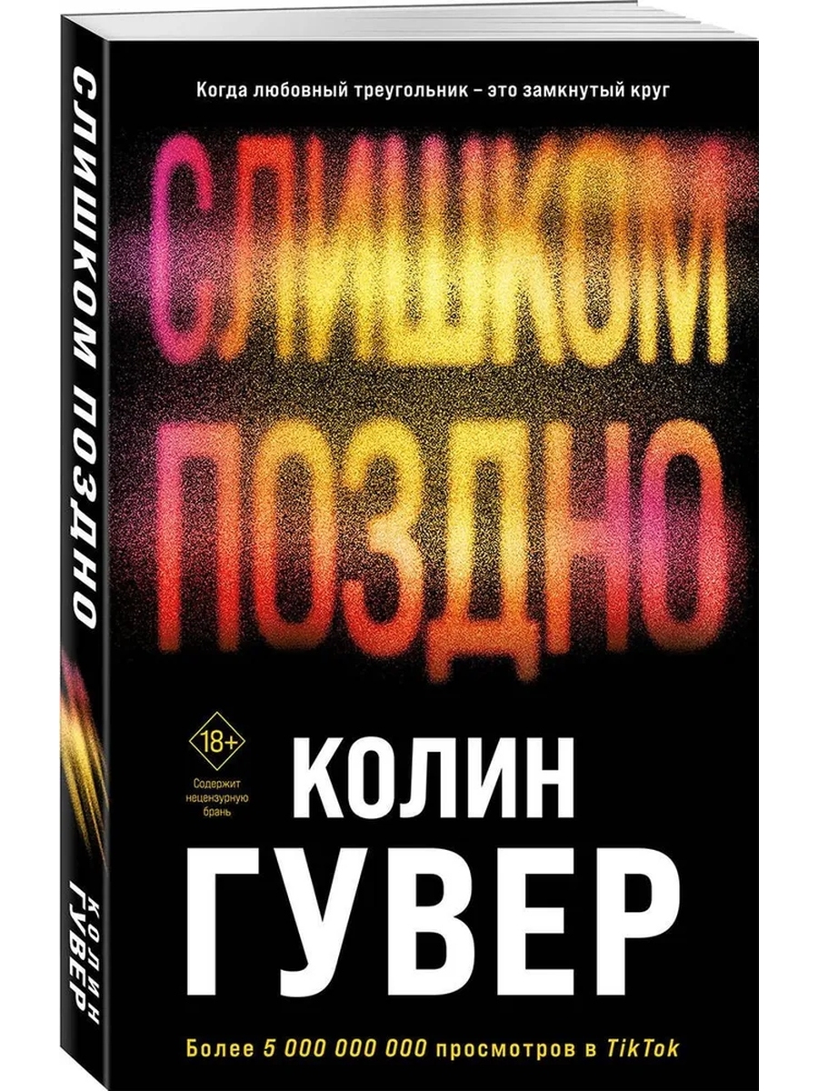 НЕЗАКОННОЕ ПОТРЕБЛЕНИЕ НАРКОТИЧЕСКИХ СРЕДСТВ, ПСИХОТРОПНЫХ ВЕЩЕСТВ, ИХ АНАЛОГОВ ПРИЧИНЯЕТ ВРЕД ЗДОРОВЬЮ, ИХ НЕЗАКОННЫЙ ОБОРОТ ЗАПРЕЩЕН И ВЛЕЧЕТ УСТАНОВЛЕННУЮ ЗАКОНОДАТЕЛЬСТВОМ ОТВЕТСТВЕННОСТЬ. Колин Гувер – автор, которому читатели доверяют свое сердце. Новый роман «Слишком поздно» разобьет его вдребезги. Более 5 000 000 000 просмотров в TikTok. Новый голос любимого автора. Эксклюзивный подарок только в первом тираже. Колин Гувер — литературный феномен нашего времени, троекратная обладательница премии Goodreads Choice Award в номинации «Любовный роман». Ее произведения переведены на десятки языков. Она — мировой тренд. Продажи книг Колин Гувер превысили продажи Стивена Кинга и Джорджа Мартина. Свет – главный символ этой книги. Когда кажется, что все вокруг погрузилось во мрак, помни про внутренний свет, чтобы увидеть свою дорогу. Слоун смогла найти у себя внутри лучик надежды и победила тьму. Свети и не смотри назад. «Я не заслуживаю того, как он со мной поступил. Никто такого не заслуживает. Надо убираться отсюда, и поскорее, пока не стало слишком поздно». Ад – не что иное, как отношения студентки Слоун с наркоторговцем Эйсой. Она бы давно ушла от него, но он содержит ее больного брата. Эйса знает о каждом ее шаге, и ей не выбраться из этой ловушки. Все меняется, когда в жизни Слоун появляется Картер, полицейский под прикрытием, который должен раскрыть Эйсу. Девушка чувствует, что ее влечет к Картеру и эти чувства взаимны. Эйса не остановится ни перед чем, чтобы уничтожить любого, кто встанет на его пути. Его одержимость растет с каждым днем, и теперь Слоун и Картер должны найти выход, пока не стало слишком поздно… «Только мы решаем, победит ли внутри нас тьма. Слоун, хрупкая девушка, скованная обстоятельствами и стокгольмским синдромом, получит шанс на спасение. Эйса, поломанный и обреченный, сделает все, чтобы ее удержать». – Джулия Вольмут, писательница