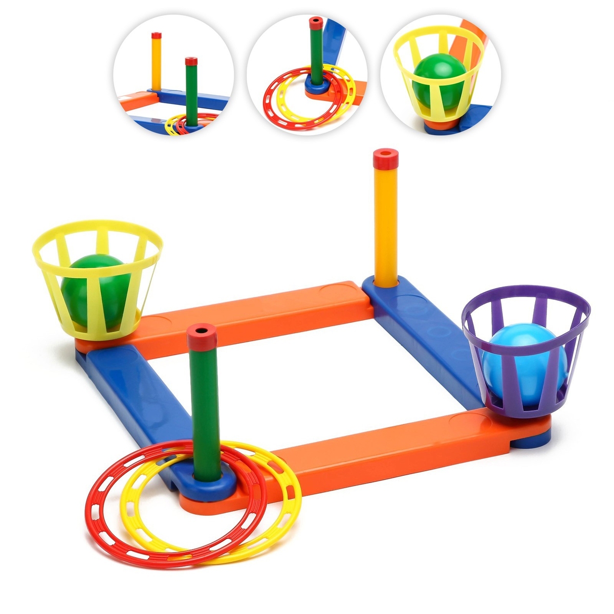 Детская игра "Кольцеброс и шароброс" - это увлекательная активная игра для детей и взрослых, в которой игрок бросает мячик и кольцо в корзинки (ловушки) и вертикальные стойки. Игрушка предназначена для активного отдыха и занятий спортом как дома, так и на свежем воздухе. Подходит для детей от 3-х лет, отлично развивает ловкость, тренирует координацию движений, точность и силу броска, укрепляет разные группы мышц. Зимой можно играть дома. Правила игры: Установите корзины и стойки. Договоритесь, с какого расстояния будете бросать мячи и кольца, какие и по сколько штук. Сначала покажите ребенку, как это делается, начав с небольшого расстояния, а затем постепенно увеличивайте дальность броска. Выигрывает тот игрок, который сделает большее количество попаданий. Вы можете установить свои правила игры (количество бросков, количество очков от попадания мяча или кольца в «свой» или «чужой» цвет, очередность попадания, бонусы за несколько попаданий подряд и т.д.). Семейная игра позволяет устроить соревнования или эстафету, в которых победит игрок, набравший наибольшее количество очков за фиксированное количество попыток. Увлекательная игра станет отличным подарком малышам и более взрослым детям на день рождения, новый год или другой праздник. Играть можно в помещении или на улице, игру легко взять с собой на прогулку, пляж, на дачу, в загородный дом, на природу или пикник. Яркий тренажер ловкости, меткости, координации движений, концентрации внимания можно установить в детском саду, школе, в детском лагере, на уличной площадке.