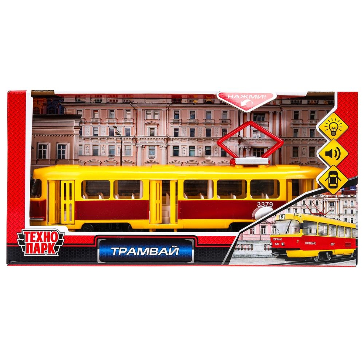 Пластиковая модель «Трамвай» ТМ «Технопарк» - прекрасный подарок для ребёнка: - световые эффекты - звуковое сопровождение - открываются двери - длина модели: 24 см - инерционный механизм (поставьте трамвай на ровную поверхность, потяните за корпус назад, отпустите - и он начнёт быстро двигаться вперёд) Пластиковая модель, выполненная с учётом всех особенностей прототипа, обязательно понравится вашему ребёнку. Благодаря открывающимся дверям, которые делают трамвай максимально похожим на настоящий, всегда можно заглянуть к нему внутрь, чтобы убедиться - каждая деталь отлично проработана. Реалистичный дизайн данной модели плюс световые и звуковые эффекты позволят с головой погрузиться в игру, придумывая новые интересные сюжеты. Кроме того, эта игрушка познакомит малыша с видами общественного транспорта. Игра с инерционной моделью ТМ «Технопарк» развивает: - координацию движений - внимание - ловкость - фантазию и воображение Размер модели: 24 х 9 х 5 см. Материал: пластмасса + металл. Работает от 3-х батареек типа LR41 (в комплекте). Рекомендовано детям от 3-х лет.