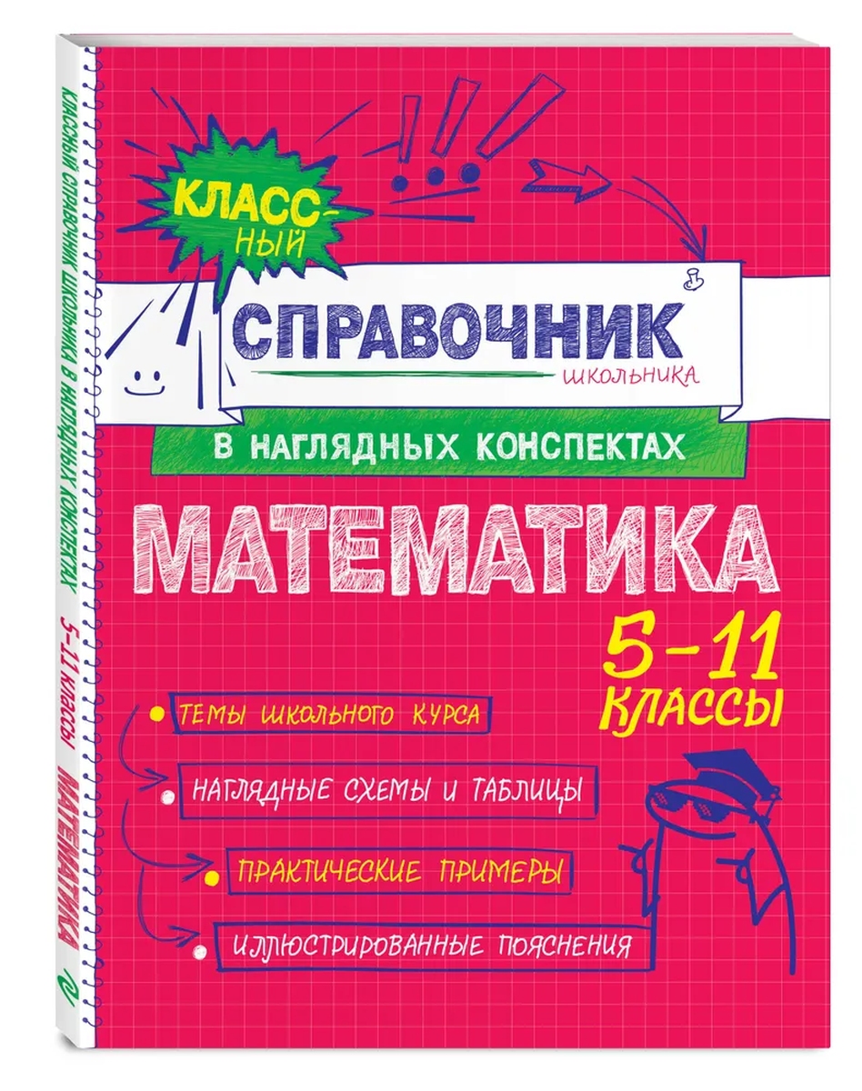 Справочник по математике в наглядных конспектах для учеников 5, 6, 7, 8, 9, 10 и 11 классов превращает изучение каждой темы в увлекательное и познавательное приключение! Книга поможет запоминать и повторять материал на протяжении всего школьного курса. Благодаря наглядной подаче теории с примерами, схемами, а также забавными рисунками, текст становится доступным и интересным. Визуальный подход обеспечивает легкость восприятия и запоминания информации, ведь она оформлена в виде конспектов, словно ученик писал их сам. Всевозможные иллюстрации и места для собственных примеров и примечаний помогут сделать процесс обучения максимально простым и приятным! А при желании можно взять маркеры и сделать свой конспект еще более уникальным и персонализированным! • Все темы школьного курса. • Доступная подача материала. • Практические примеры. • Наглядные схемы и таблицы. • Множество забавных картинок. • Место для ваших записей и собственных рисунков. Погрузитесь в увлекательный мир математики вместе с наглядным справочником для подростков и почувствуйте, как знания становятся ближе, а учеба лучше! Книжка поможет подготовиться к ОГЭ, ЕГЭ и другим экзаменам 2026. Также пособие будет полезно для занятий родителей с детьми.