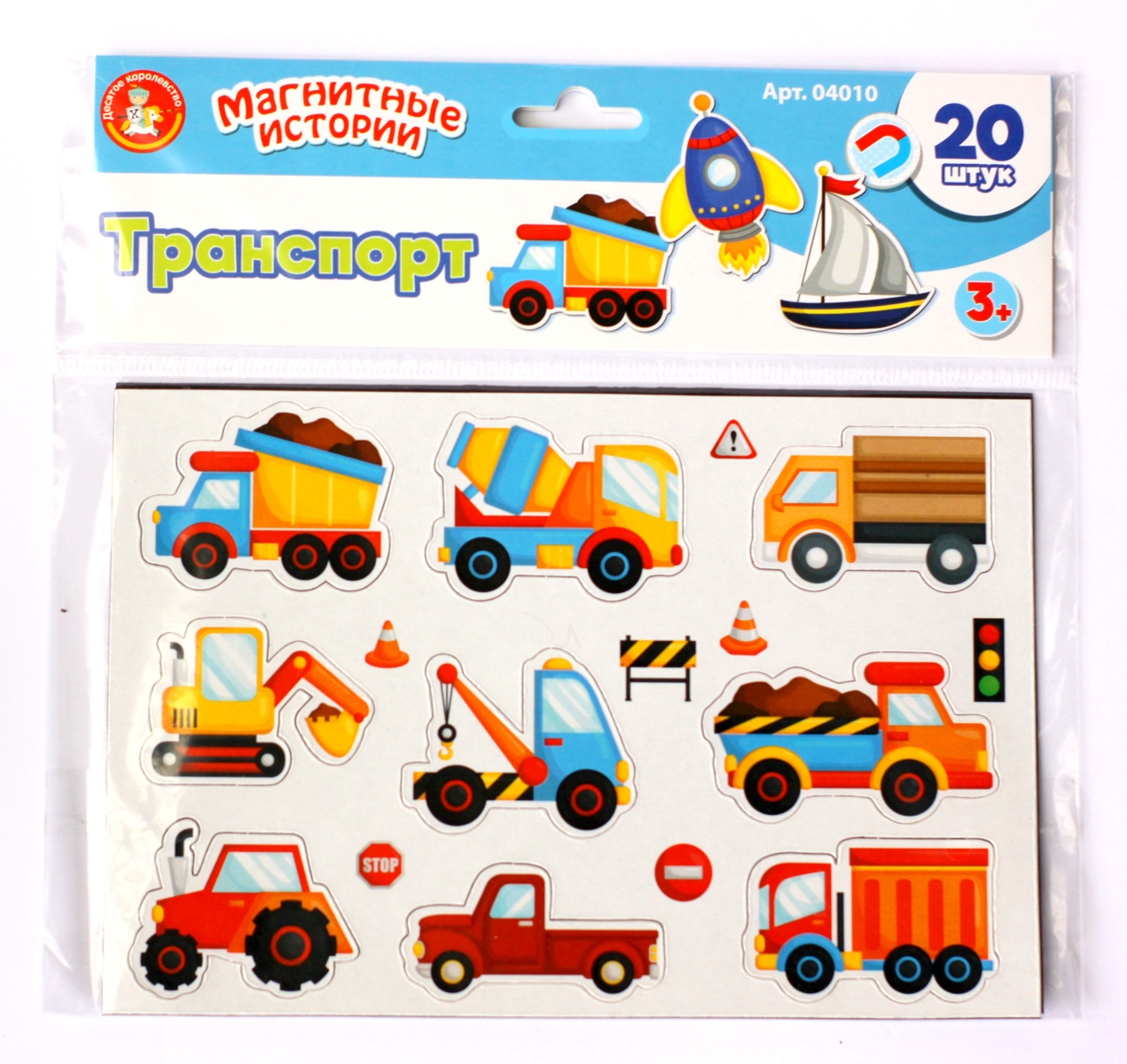 Изучаем различные виды средств передвижения с развивающими магнитами «Транспорт» из серии «Магнитные истории»! Состав набора: • фигурные магниты – 20 шт. (от 3 до 5 см в ширину, до 6 см в высоту) Игра предназначена для детей от 3 лет. Магниты размещены на листах-рамках размером 21,5 х 14,5 см, из которых легко вынимаются. В наборе – 19 видов транспорта, представленные в виде отдельных магнитов, которые крепко держатся на любой металлической поверхности – от дверцы холодильника до специального магнитного планшета (не входит в набор, приобретается отдельно). Также в комплект входит магнит с человечком, что позволяет сделать игру ещё интереснее или даже устроить домашний спектакль! Научите ребёнка различать виды специальных машин – расскажите, для чего используется бетономешалка, зачем нужен трактор и т.д. Познакомьте малыша с самыми различными видами транспортных средств – от воздушного шара до космической ракеты. Игра с магнитами «Транспорт» развивает знания ребёнка об окружающем мире, тренирует мелкую моторику и стимулирует творческие способности.