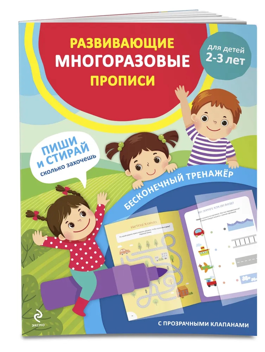 Это необычная многоразовая тетрадь для детей от 2-х до 3-х лет: бумажные страницы справа и слева накрываются прозрачными клапанами из специального материала — по нему можно многократно писать любым фломастером или маркером, а потом стирать написанное влажной салфеткой. Пользоваться такими прописями можно бесконечно долго, совершенствуя правильность выполнения графических заданий, точность написания цифр и букв. Пособие поможет ребёнку развить мелкую моторику и совершенствовать когнитивные функции мозга: память, внимание, логическое мышление. Большинство заданий в книге имеет несколько вариантов решения, поэтому лучше, если ребёнок начнёт знакомиться с пособием в присутствии взрослого, который может задать наводящие вопросы или попросить малыша выполнить какое-то упражнение несколько раз. В дальнейшем дошкольник может с удовольствием выполнять знакомые упражнения самостоятельно. Ребёнок будет писать в прописях много-много раз, не задумываясь: «А вдруг не получится?» Развивающие игрушки, как и развивашки от 2-х лет, способствуют формированию учебных навыков у дошкольников. Игры с такими пособиями полезны как для девочек, так и для мальчиков и станут отличным подарком ребенку на день рождения или Новый год. Книга издательства «ЭКСМО» станет для малыша любимой игрушкой, которую он не захочет выпускать из рук.