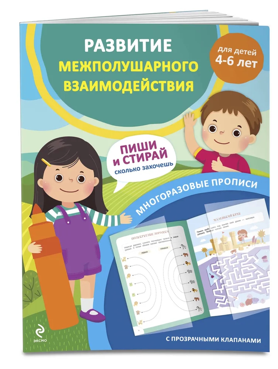 Эта необычные многоразовая тетрадь разработана для развития межполушарного взаимодействия между правым и левым полушариями головного мозга ребёнка от 4 до 6 лет. Бумажные страницы справа и слева накрываются прозрачными клапанами из специального материала — по нему можно многократно писать любым фломастером или маркером, а потом стирать написанное влажной салфеткой. Пользоваться такими прописями можно бесконечно долго, совершенствуя правильность выполнения графических заданий, точность написания цифр и букв. Развитие межполушарного взаимодействия происходит при помощи игровых заданий, которые задействуют оба полушария головного мозга: рисование обеими руками одновременно, выполнение зеркальных рисунков, упражнения на координацию движений, логические задачи и так далее. В результате образуются новые нейронные связи, которые помогают ребёнку выработать творческий подход к познанию мира и эффективнее учиться. Большинство заданий в книге имеет несколько вариантов решения, поэтому лучше, если ребёнок начнёт знакомиться с пособием в присутствии взрослого, который может задать наводящие вопросы или попросить малыша выполнить какое-то упражнение несколько раз. В дальнейшем дошкольник может с удовольствием выполнять знакомые упражнения самостоятельно. Ребёнок будет писать в прописях много-много раз, не задумываясь: «А вдруг не получится?» Развивающие игрушки, как и развивашки от 4-х лет, способствуют формированию учебных навыков у дошкольников. Игры с такими пособиями полезны как для девочек, так и для мальчиков и станут отличным подарком ребенку на день рождения или Новый год. Книга Издательства «ЭКСМО» станет для ребенка любимым тренажёром, который поможет ему успешно подготовиться к поступлению в первый класс.