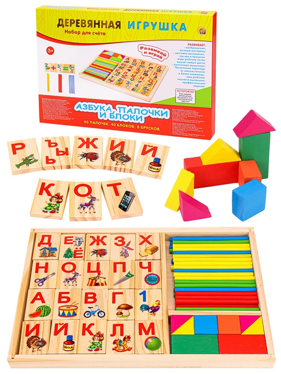 Учим буквы АЗБУКА ПАЛОЧКИ И БЛОКИ деревянный ИД-3790