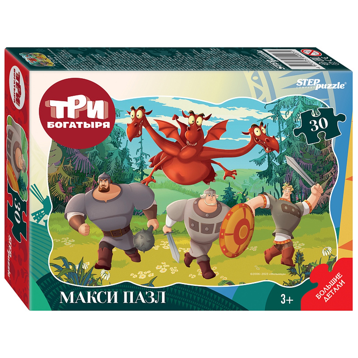 Контурный макси пазл «Три богатыря» c героями одноименного мультфильма. Фигурный пазл с крупными деталями эргономичен для детской руки. Развивает внимание и память. Тренирует мелкую моторику. Характеристики пазла: крупные детали пазла ≈ 5×4,5 см; размер собранного изображения – 27х18 см; материал – картон; качественное изображение; фигурная рамка; экологически чистые, нетоксичные материалы (компания Step Puzzle гарантирует высокое качество пазла и точность подгонки).