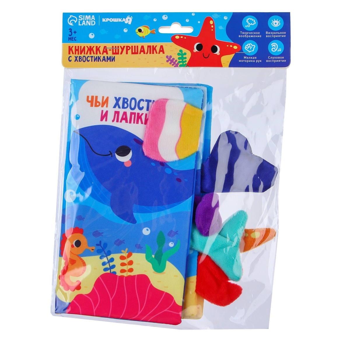 Текстильная книжка-шуршалка «Морские животные. Чьи хвостики и лапки?» станет идеальным выбором для малышей от 3 месяцев. Компактный размер и яркие страницы помогут познакомить ребёнка с животными, развивая внимание и слуховое восприятие. Особенности Книжка выполнена из мягкого текстиля с шуршащими элементами для тактильного и звукового развлечения. В книжке есть хвостики и лапки разных морских обитателей. Малышу будет интересно их трогать и угадывать, кому они принадлежат. 8 страниц с простыми и понятными изображениями для самых маленьких. Мягкий переплёт обеспечивает безопасность и удобство использования малышом. Подходит для игр дома или в дороге благодаря компактному размеру. Играем с пользой Эта книжка не только развлекает, но и обучает ребёнка первым словам, развивая речь и зрительное восприятие. Шуршащие элементы стимулируют слуховое внимание, а яркие картинки привлекают взгляд малыша. Родители могут использовать книжку для совместных занятий, добавляя эмоции и звуки к каждому изображению. Играйте и развивайтесь вместе с Крошка Я!