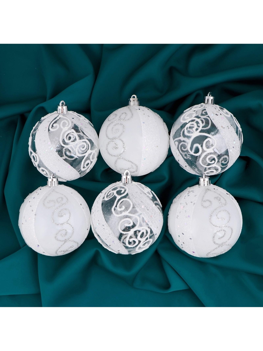 Набор шаров пластик 8см 6шт Ажурные завитки белый 1009394