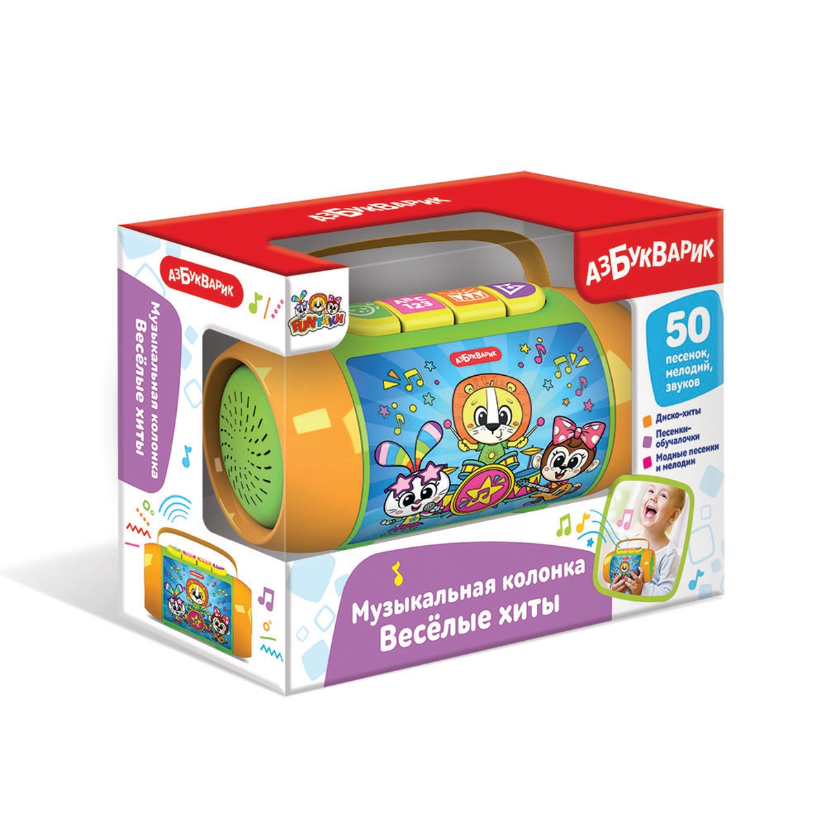 Суперновинка! Стильная музыкальная колонка для малышей! Нужно просто нажимать на кнопочки – песенки и мелодии будут звучать нон-стоп, один хит за другим! Всего в музыкальной колонке «Весёлые хиты» собрано 20 песенок и мелодий с множеством забавных звуков! Здесь есть и диско-хиты («Фантики», «Круто!», «Танцевать умеют дети», «Барабаны», «Оркестр»), и песенки-обучалочки («Музыкальный алфавит», «Мы считаем с песенкой», «Разноцветный кораблик», «Вкусные формы», «Противоположности»), и модные песенки («Парк развлечений», «Сладкоежки», «Питомцы», «Стало солнышко теплей», «Пляшут весело детишки»), и танцевальные мелодии. На каждой кнопочке – 5 песенок или мелодий. При нажатии песенки и мелодии будут звучать по очереди без остановки. Для выключения игрушки нужно использовать тумблер вкл./выкл. У музыкальной колонки «Весёлые хиты» удобный ремешок – ее можно всюду носить с собой! Устройте музыкальный праздник для детей во дворе, в гостях, в парке, на пикнике в лесу – где угодно! Пойте и танцуйте нон-стоп!
