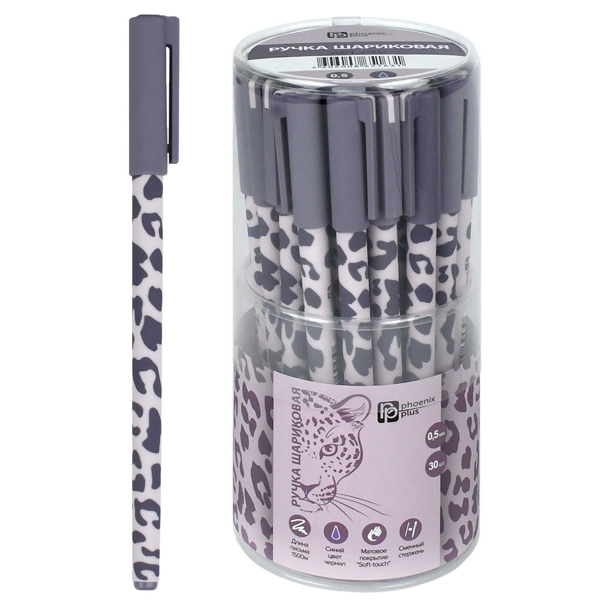 Ручка шариковая арт. 71857 / 30 ЛЕОПАРД СИРЕНЕВЫЙ (ПВХ тубус, 30 шт., неавтоматическая, 7х150 мм, цв