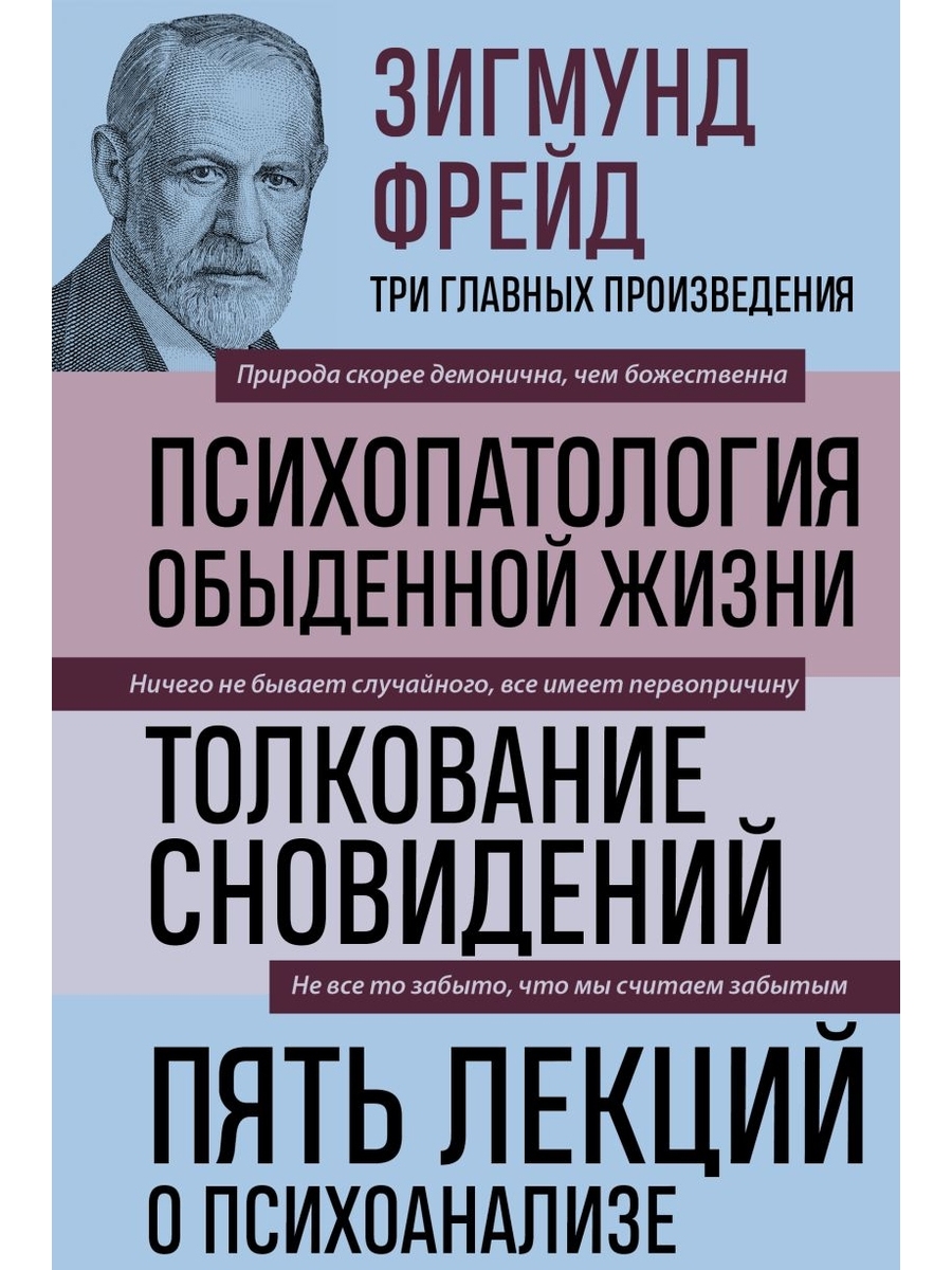 Зигмунд Фрейд оказал значительное влияние на психологию, медицину, социологию, антропологию, литературу и искусство XX века. Среди крупнейших достижений Фрейда: обоснование понятия «бессознательное», разработка теории эдипова комплекса, создание метода свободных ассоциаций и методики толкования сновидений. В книге собраны самые яркие и популярные труды философа: «Психопатология обыденной жизни», «Толкование сновидений» и «Пять лекций о психоанализе». Философские трактаты как нельзя лучше отражают позицию автора и дарят читателю возможность оценить творческое наследие Зигмунда Фрейда. «Толкование сновидений» — важнейшая из работ Фрейда. Именно здесь впервые появляется понятие «бессознательное» и закладываются основы для психоанализа. «Психопатология обыденной жизни» до сих пор является ключевой работой теории психоанализа, так как рассматривает одну из основополагающих концепций учения — парапраксис (незначительные машинальные ошибки, оговорки и т. п.). «Пять лекций о психоанализе» — краткое, но, тем не менее, очень полное изложение учения Фрейда, включающее конкретные примеры, которые иллюстрируют применение психоанализа на практике.