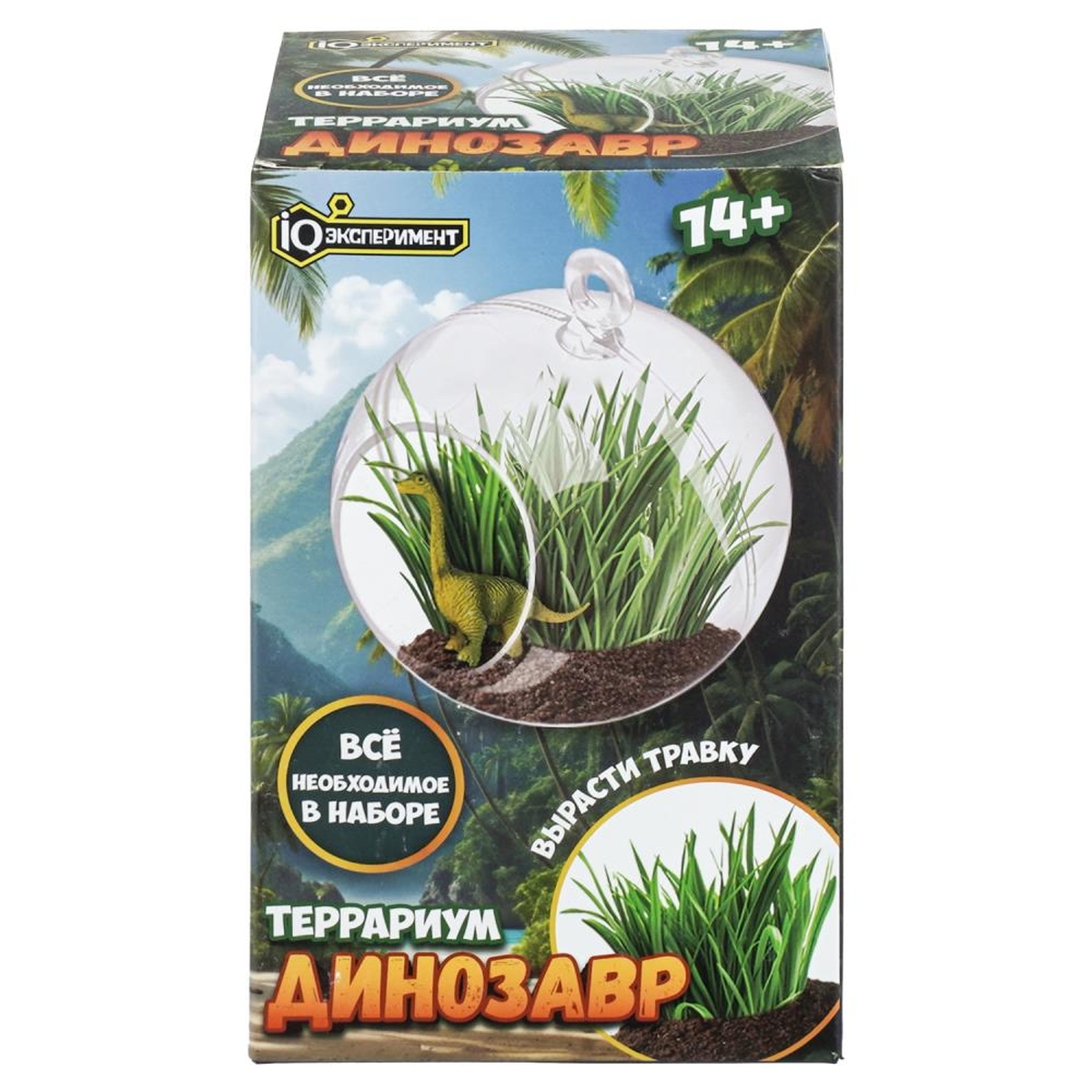 Набор для опытов по выращиванию растений «Террариум. Динозавр» ТМ «IQ Эксперимент» создан специально для юного садовода: - оригинальный дизайн + фигурка - простая и понятная инструкция - всё необходимое в наборе - для прорастания семян потребуется 3-5 дней В комплекте: - пластиковый шар-основа (террариум) - пакет с почвой - пакетик с семенами - фигурка динозавра При помощи этого увлекательного набора маленький любознайка сможет провести эко-опыт и создать оригинальную растительную композицию в виде террариума с динозавром. Для этого нужно посадить семена в почву на глубину примерно 1 см; далее необходимо поливать почву по мере необходимости, чтобы она всё время была увлажнена; шар следует поставить/подвесить в солнечном светлом месте и наблюдать за ростом растений. Когда трава подрастёт, можно будет добавить фигурку. Набор познакомит ребёнка с основами садоводства и покажет процесс всхода растений. Благодаря тому, что зелень растёт в любое время года, набор в красивой упаковке подойдёт для подарка на любой праздник. Игра с набором ТМ «IQ эксперимент» способствует изучению окружающего мира и развивает: - ответственность - интеллект - творческие способности Размер: 9 x 7 x 7 см. Материал: пластмасса. Рекомендованный возраст: 14+.