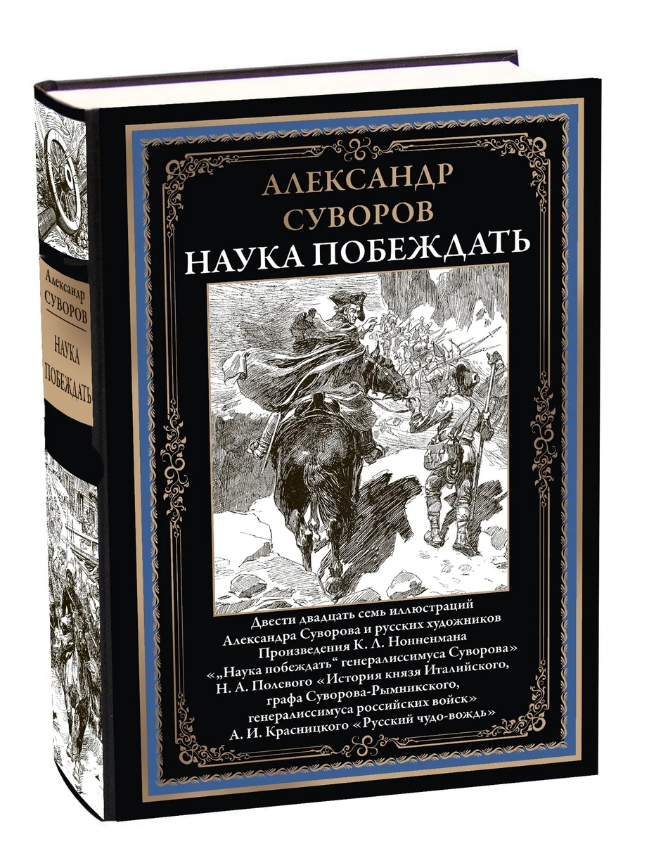 Александр Суворов Наука побеждать Двести двадцать семь иллюстраций Александра Суворова и русских художников. Произведения К. Л. Нонненмана «„Наука побеждать“ генералиссимуса Суворова» Н. А. Полевого «История князя Италийского, графа Суворова-Рымникского, генералиссимуса российских войск» А. И. Красницкого «Русский чудо-вождь» БМЛ Том 379 В сборник вошли «Наука побеждать» — знаменитый трактат по боевой подготовке войск русского полководца Александра Васильевича Суворова (1730–1800), книга капитана Константина Людвиговича Нонненмана (1865–после 1915) «„Наука побеждать“ генералиссимуса Суворова», сочинения Николая Алексеевича Полевого (1796–1846) «История князя Италийского, графа Суворова-Рымникского, генералиссимуса российских войск» (1843) и Александра Ивановича Красницкого (1866–1917) «Русский чудо-вождь: граф Суворов-Рымникский, князь Италийский, его жизнь и подвиги» (1910), и в качестве приложения — исследование Василия Алексеевича Алексеева (1863–1919) «Суворов-поэт» (1901). Сборник проиллюстрирован рисунками и чертежами самого А. В. Суворова в копиях и с пояснениями К. Л. Нонненмана, а также картинами и элементами оформления художников Рудольфа Казимировича Жуковского (1814–1886), Александра Евстафьевича Коцебу (1815–1889), Николая Семеновича Самокиша (1860–1944), Иоганна Генриха Шмидта (1749–1829) и писателя Тараса Григорьевича Шевченко (1814–1861) (всего 227 иллюстраций). Александр Васильевич Суворов (1730–1800), князь Италийский, граф Рымникский и Священной Римской империи, генералиссимус русской армии и генерал-фельдмаршал австрийской — величайший русский полководец, крупнейший стратег и непревзойденный тактик своего времени. Настоящий сборник открывает его знаменитая инструкция по боевой подготовке войск — «Наука побеждать». Точное время составления этого документа не установлено; обычно считают, что основные положения были выработаны Суворовым еще в бытность его командиром Суздальского полка (ок. 1768 г.), а окончательный вариант сложился уже после польской кампании 1794 г. При жизни Суворова «Наука побеждать» не издавалась и распространялась в рукописных списках, до нас не дошло ни одного экземпляра, подписанного ее автором. Для настоящей публикации были использованы два наиболее старых варианта — М. Антоновского (1806 г.) и П. Кузнецова (1809 г.), а в основу был положен вариант, хранящийся в Российском государственном военно-историческом архиве, сверенный с текстом П. Кузнецова. Таким образом, публикуемый текст должен быть очень близок к подлинному. Следующая книга сборника составлена капитаном Константином Людвиговичем Нонненманом (Ольшевским) (1865–после 1915) — «„Наука побеждать“ генералиссимуса Суворова»; по утверждению составителя, в книгу вошли материалы, заключающиеся в записках и копиях с собственноручных чертежей и рисунков генералиссимуса Суворова и его же надписей к ним на различные вопросы военного дела. Вступительная статья принадлежит перу Александра Николаевича Апухтина (1861/1862–1928) — русского военачальника, генерал-лейтенанта, участника русско-японской и Первой мировой войн. Продолжают сборник два биографических романа, посвященных Суворову, написанных Николаем Алексеевичем Полевым (1796–1846) «История князя Италийского, графа Суворова-Рымникского, генералиссимуса российских войск» (1843) и Александром Ивановичем Красницким (1866–191