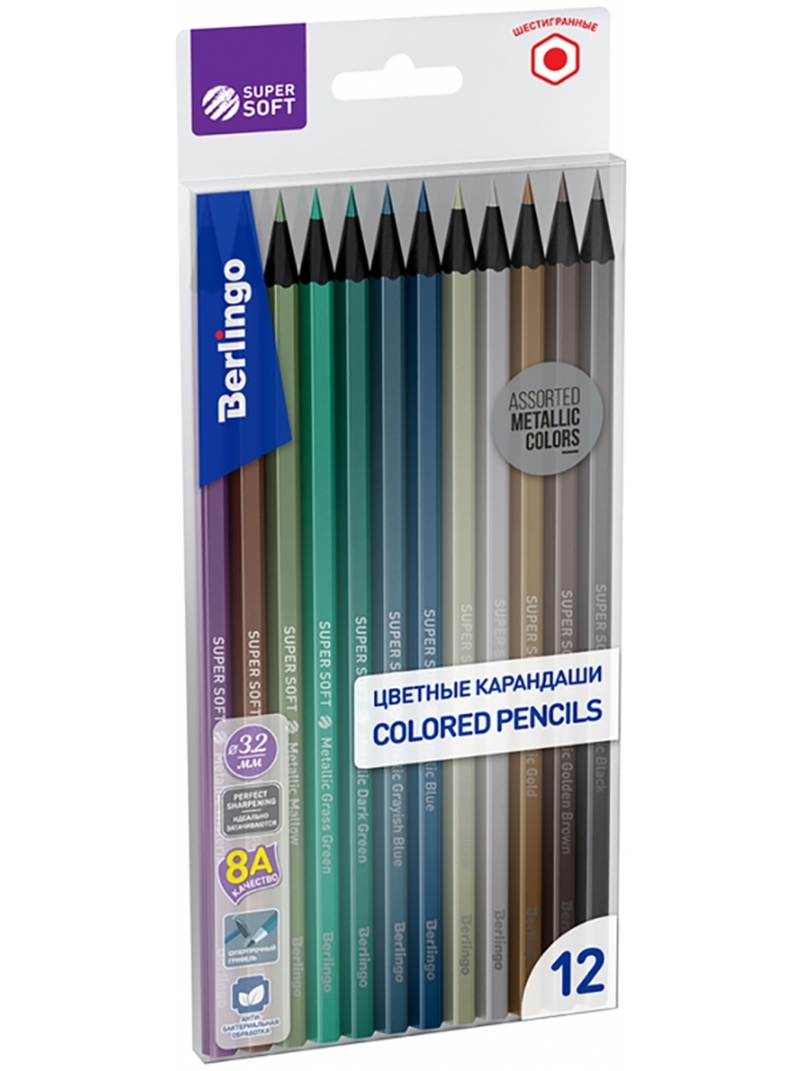 "SuperSoft" - линейка качественно новых цветных карандашей Berlingo. Набор цветных карандашей с металлическим блеском. Черное дерево. Шестигранная форма. Грифель высочайшего стандарта качества 8А, являющегося максимальным для нехудожественных цветных карандашей, состоит из высококачественных пигментов ярких оттенков с металлическим блеском. Комфортное и мягкое рисование на бумаге любого типа, в том числе и на бумаге черного цвета. Увеличенная до 3,2 мм толщина грифеля для безупречно комфортного раскрашивания. Указание цвета на каждом карандаше на английском языке. Поле для подписи имени владельца на каждом карандаше. Уникальная формула и технология производства грифелей, в результате которой достигается одновременно удивительная мягкость письма и прочность, позволяющая грифелю выдерживать даже сильное нажатие под углом 45 градусов. Специальная проклейка, предотвращающая поломку грифеля внутри карандаша при падении. Стойкость к повреждениям. Корпус из древесины высшего качества, прошедшей тщательную обработку. Материал, сохраняющий свою прочность и легко поддающийся ровной заточке без усилий. Уникальная антибактериальная обработка на специализированном оборудовании, гарантирующая безопасное использование продукции детьми. Длина: 180 мм. Количество цветов: 12. Диаметр грифеля: 3,2 мм. Диаметр корпуса: 7 мм. Ударопрочный грифель.