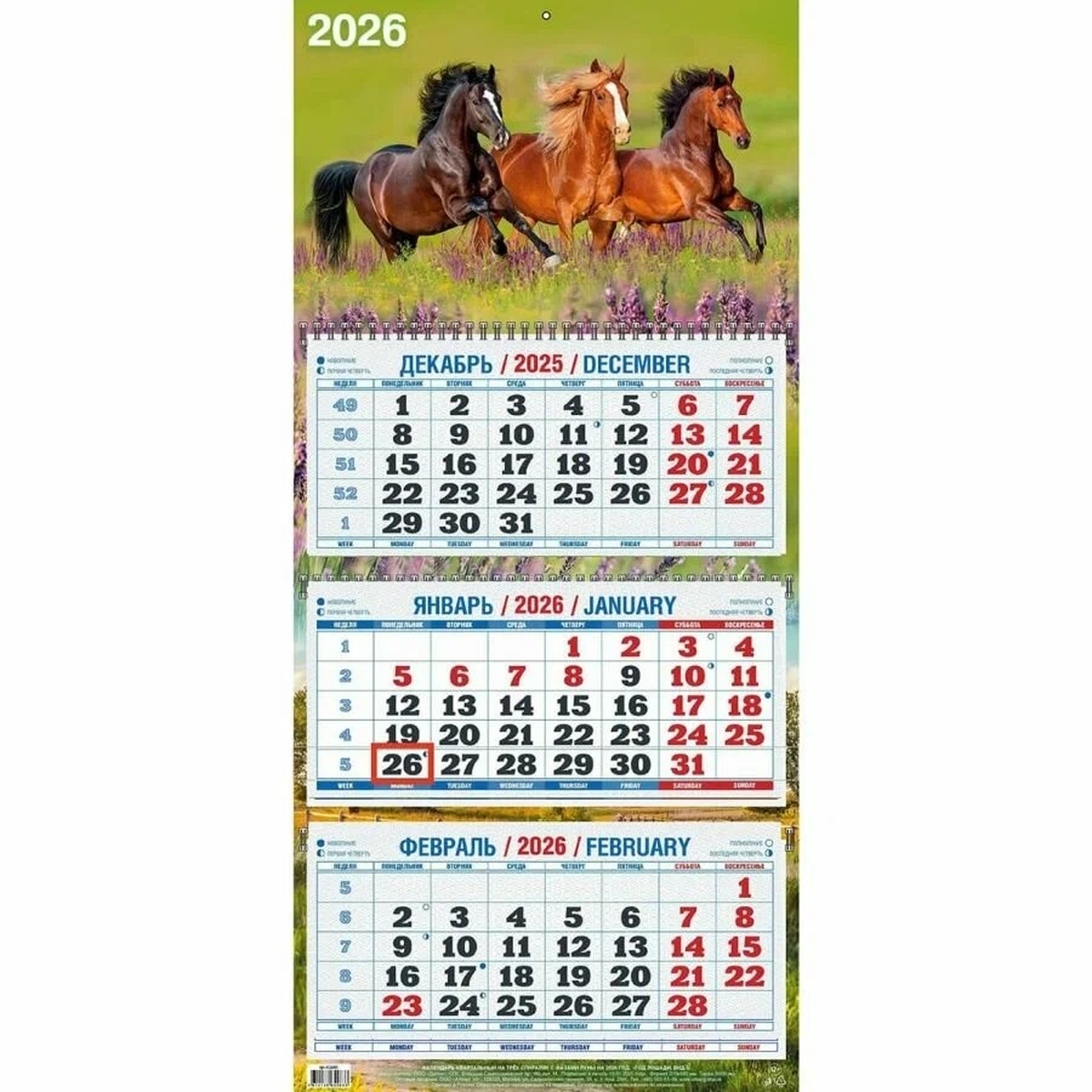 Квартальный настенный календарь «Год лошади 5» на 2026 год от бренда Атберг98 — это идеальное сочетание эстетики, функциональности и высокого качества полиграфии. Его крупный формат (310х680 мм) и четкая структура делают его превосходным инструментом для планирования и организации рабочего времени как в офисе, так и дома. Конструкция календаря включает три удобных блока, каждый из которых размещен на красочной полноцветной подложке. Для удобства ориентации во времени предусмотрен специальный курсор, который легко перемещается по месяцам и неделям. Нумерация недель и крупные цифры на офсетной бумаге обеспечивают прекрасную читаемость даже с большого расстояния. Производство календаря отвечает высоким стандартам: яркий постер отпечатан на плотном мелованном картоне 250 г/м² с глянцевым УФ-лаком, что придает изображению насыщенность и защищает от выцветания. Блоки напечатаны на качественной офсетной бумаге 60 г/м², а их подложки — на прочном картоне плотностью 200 г/м². Надежное крепление на трех металлических гребнях гарантирует долговечность и удобство перелистывания месяцев. Благодаря встроенному кольцу (пикколо) его легко и быстро можно повесить на стену Квартальный настенный календарь Атберг98 «Год лошади 5» - это надежный помощник в планировании дел на весь год, но и стильный элемент декора.