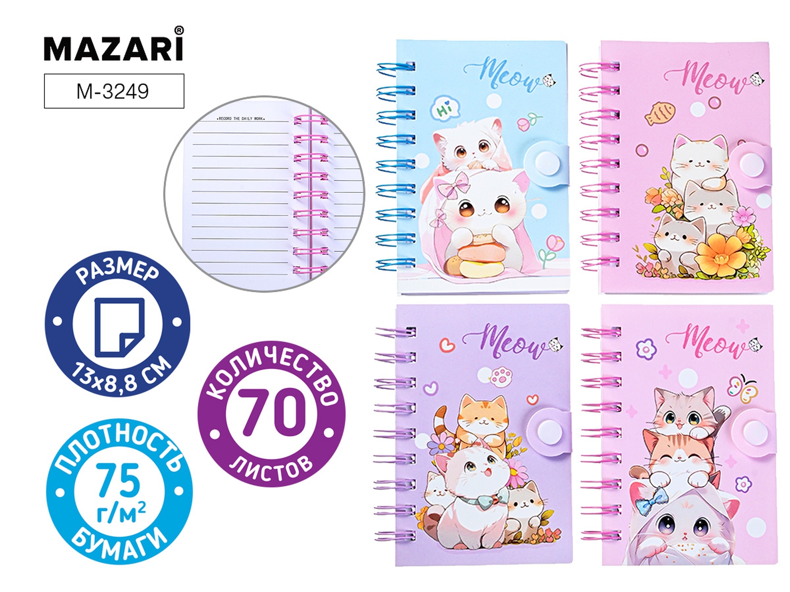 Блокнот на спирали 13х8.8 см, MEOW, 70 листов, линованный внутренний блок, плотность бумаги 75 г/м2,