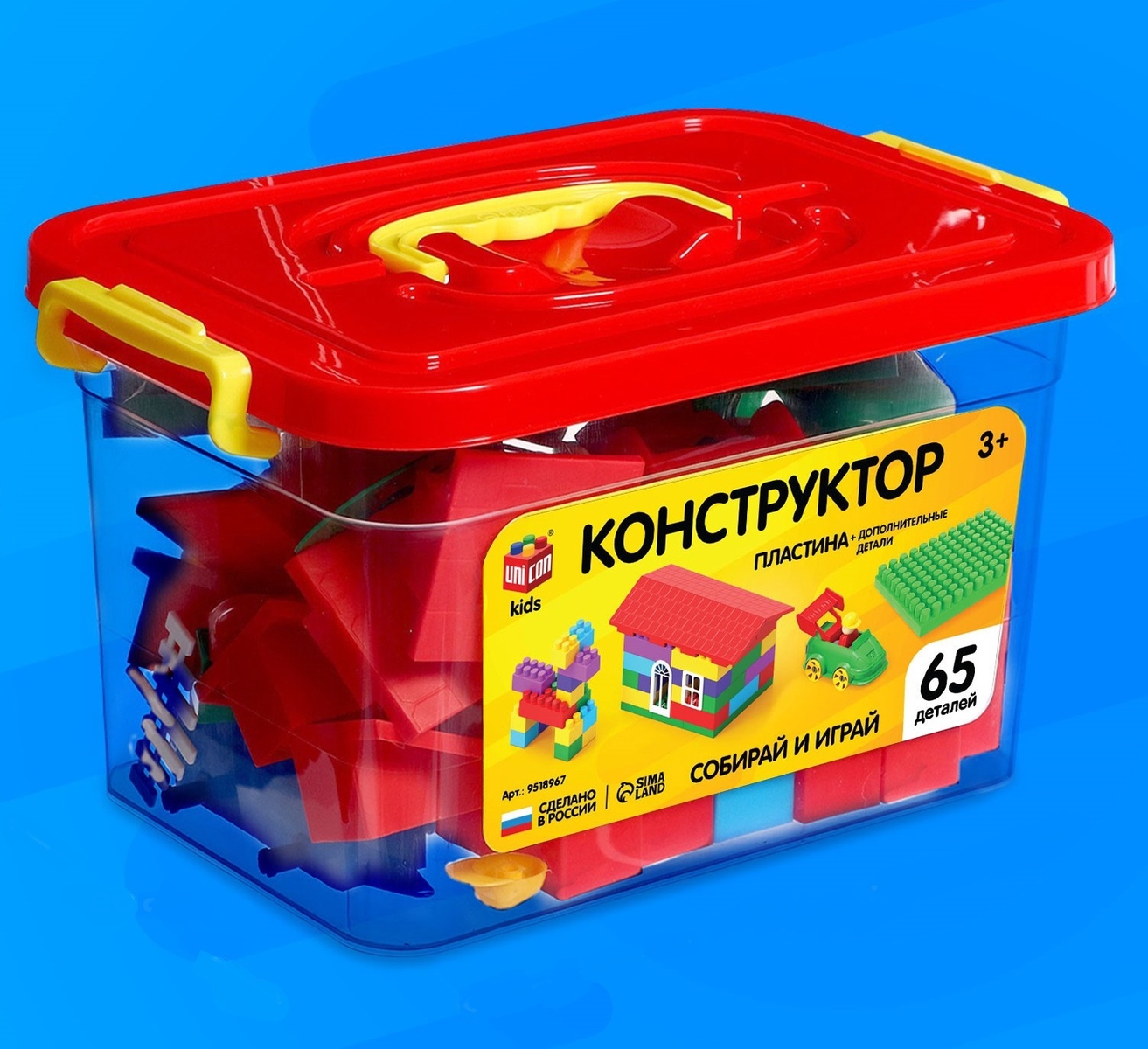 Конструктор — отличный способ увлечь ребёнка и познакомить его с различными фигурами и цветами, развить пространственное мышление и воображение. Особенности конструктора Правильная форма и выверенная геометрия обеспечивают точную стыковку деталей и исключают люфт. Разнообразие и насыщенность цветов радуют глаз. Есть удобный бокс для хранения. В комплект входит пластина-фундамент для строительства дома. Полная безопасность Все элементы изготовлены из гипоаллергенного полипропилена. Материал и красители в составе конструктора — сырьё, не подвергавшееся переработке, а значит, совершенно безопасное для детей. Края деталей обрабатываются вручную, а затем проходят дополнительную проверку на отсутствие острых мест, поэтому малыш никогда не поцарапается во время игры. Безопасный и прочный материал практически не ломается и выдерживает большие нагрузки. Конструктор разработан и произведён в России из российских материалов и соответствует всем ГОСТам. Строгий контроль на всех этапах, начиная от производства, заканчивая упаковкой товара, исключает брак и делает конструктор действительно качественным. Имеет сертификат соответствия ЕАС.