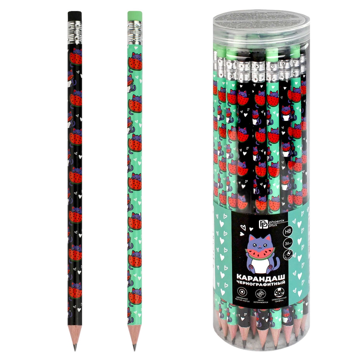 Карандаш чернографитный арт. 70082 / 36 КОТЕНОК С АРБУЗОМ (ПЭТ-тубус, 36 шт., ассорти, твердость гри