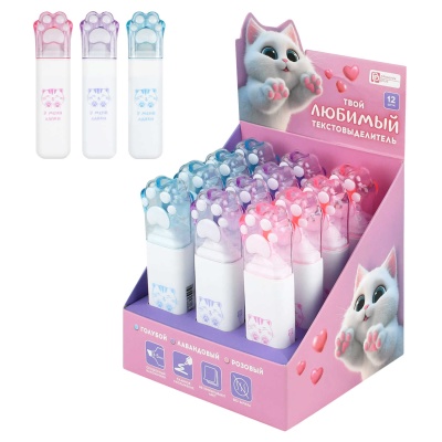 Текстовыделитель 12шт Пушистые лапки голубой розовый сиреневый 72271