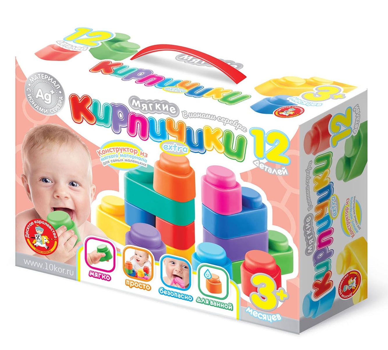 Красочный набор из 12 мягких кирпичиков от «Десятого королевства» может стать первым конструктором в жизни вашего малыша. Материал антибактериальных кирпичиков с ионами серебра гарантирует безопасность, даже если вашему крохе захочется попробовать детали на зуб! А как удобно держать кирпичики в маленькой ручке! Состав набора: • одинарный элемент – 7 шт. (ДШВ: 5 х 5 х 5 см) • двойной элемент – 3 шт. (ДШВ: 10 х 5 х 5 см) • тройной элемент – 2 шт. (ДШВ: 15 х 5 х 5 см) Этот красочный и мягкий конструктор предназначен специально для самых маленьких детей возрастом от 3 месяцев. Все элементы игрушки выполнены из безопасного для ребёнка материала нового поколения со специальной антимикробной добавкой. Благодаря ионам серебра, материал конструктора обладает антибактериальным эффектом и обеспечит вашему малышу максимально безопасную игру на длительное время (более 5 лет), даже если захочется попробовать кирпичик на вкус. В набор входят 12 деталей, которые хорошо крепятся между собой, крутятся, их удобно использовать также для игры в ванной или в песочнице. Все детали конструктора мягкие, без острых углов, бархатистые на ощупь и приятные для детских ручек. Цвета кирпичиков яркие, насыщенные. Под контролем сертификационного центра были проведены всевозможные испытания материала и выдан сертификат допуска – для детей от 3 месяцев. Конструктор из мягкого материала для самых маленьких с ионами серебра развивает мелкую моторику, координацию, хватательные движения, фантазию и усидчивость, учит соединять и разъединять предметы, а также различать цвета.
