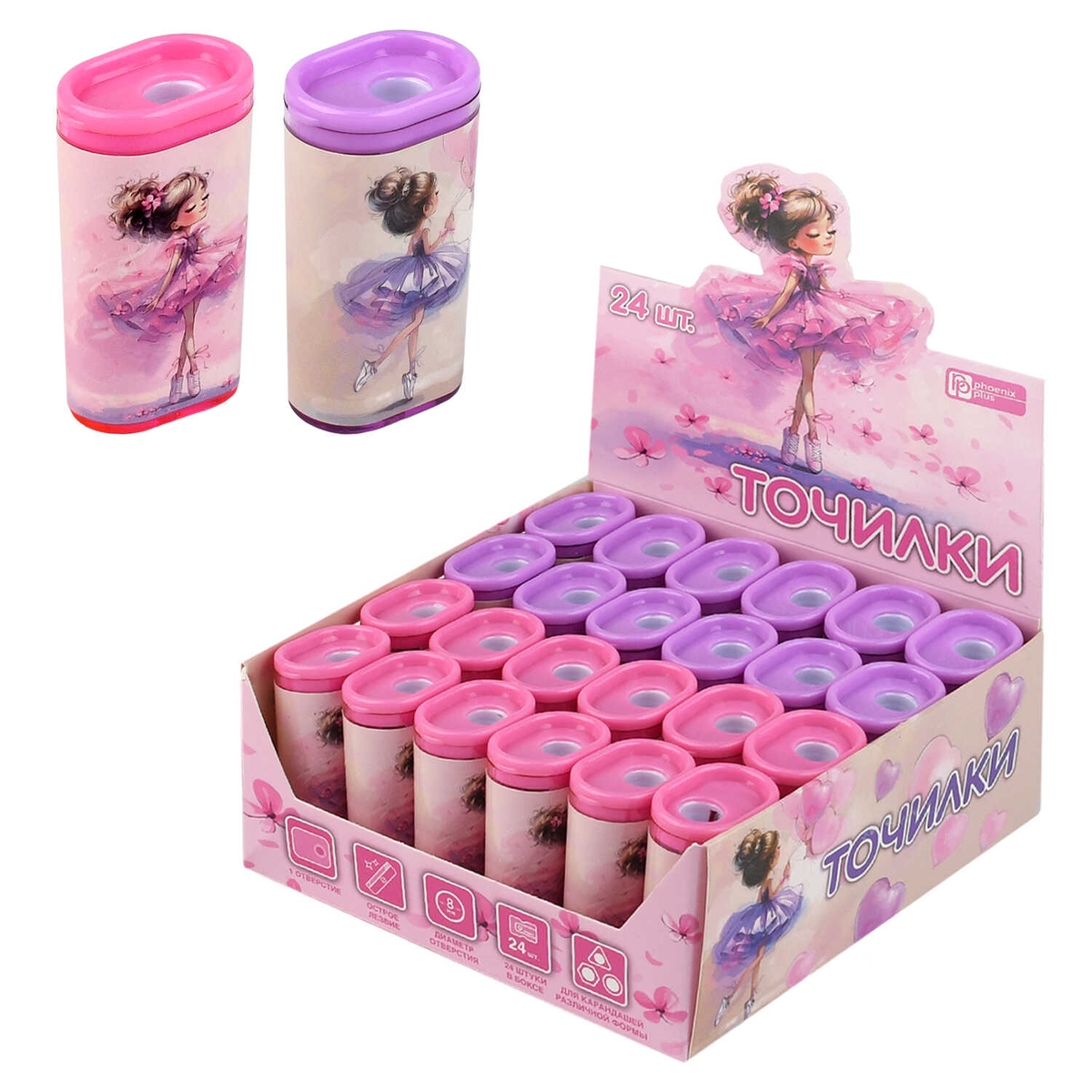 Точилка БАЛЕРИНЫ 24 шт ассорти полистирол розовый сиреневый 1 отверс 72687