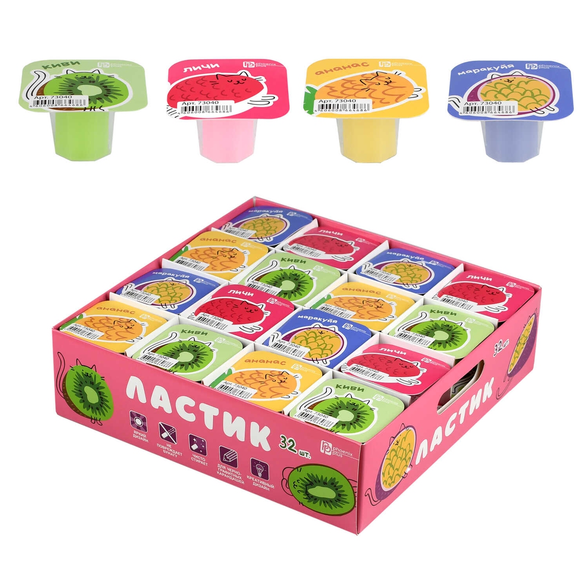 Ластик ФРУКТОВОЕ АССОРТИ 29х24х24 мм ассорти разноцветный 73040
