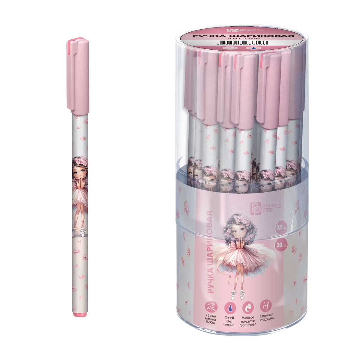 Ручка шар 0,5мм Синяя БАЛЕРИНА С ЦВЕТОЧКАМИ тубус 30 шт 72895