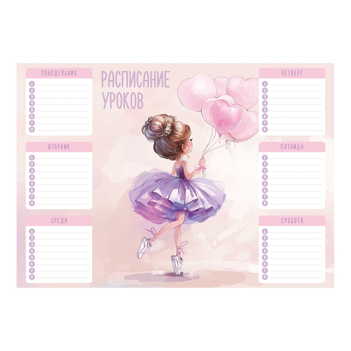 Расписание уроков А4 БАЛЕРИНА С ВОЗДУШНЫМИ ШАРИКАМИ 210x297 мм мелованный картон 72587