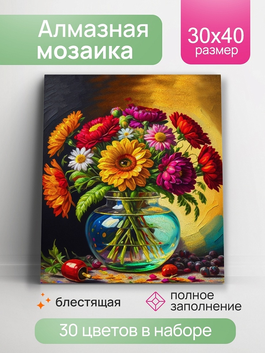 Алмаз мозаика 30х40 см с подр с полн заполн блест 30цв Цветной букет АЛМ-0032